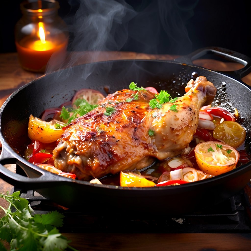 Когда курица приобретет румяный оттенок, снизьте огонь до среднего, накройте сковороду, продолжая готовить еще 15-20 минут. Проверка на готовность: простой прокол – если сок прозрачный, курица готова, в противном случае дайте ей немного постоять на огне.