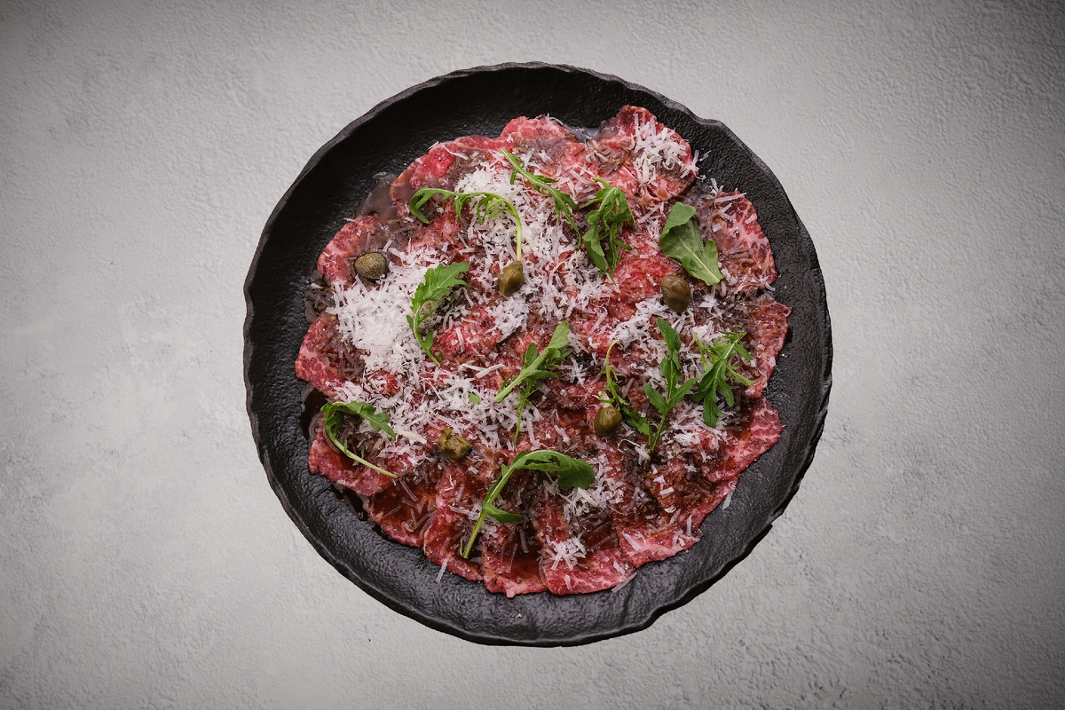 - Карпаччо из денвера — тонко нарезанная говядина с пармезаном, руколой и каперсами (от 350 ?).