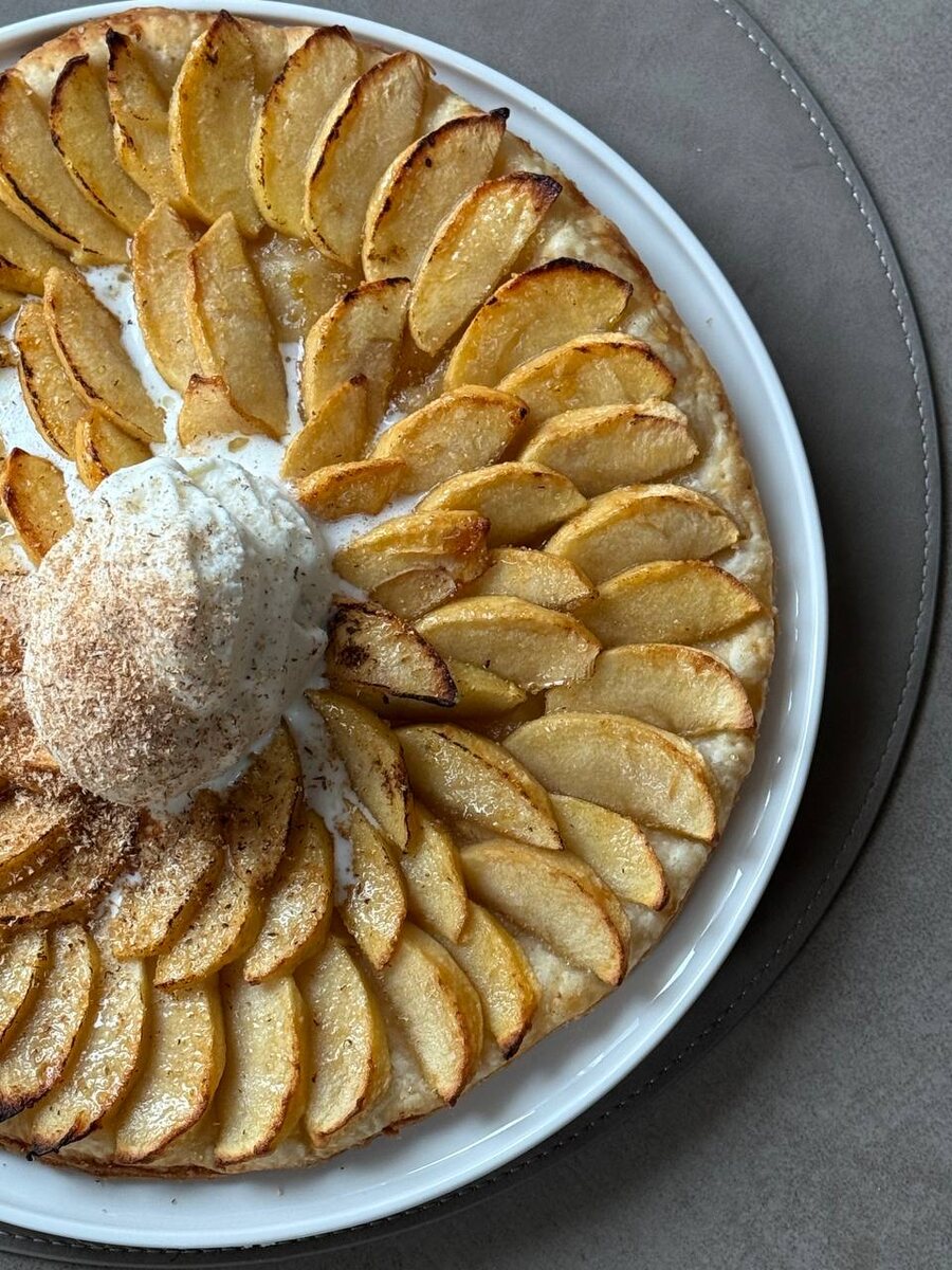 При подаче необходимо натереть сверху немного мускатного ореха и дополнить десерт шариком любимого мороженого. В результате получается невероятно вкусный и ароматный десерт, который можно будет запомнить надолго! И, вероятно, стоит приготовить сразу два пирога, потому что один может не дожить до вечера.