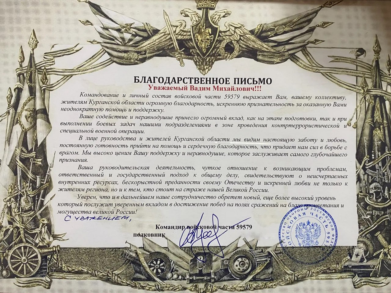 «Командование и личный состав войсковой части 59579 выражает Вам, вашему коллективу, жителям Курганской области огромную благодарность, искреннюю признательность за оказанную Вами неоднократную помощь и поддержку. <…>