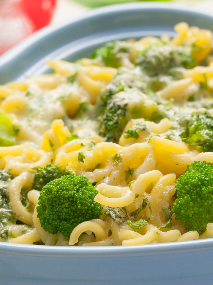 4. Брокколи стоит разобрать на соцветия и за три минуты до окончания варки макарон добавить их в кастрюлю. Это позволит капусте немного размягчиться.