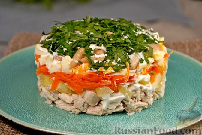- Слоёный салат с курицей: сочетание куриного филе, сладкого перца и фасоли, которое порадует вашей креативностью.