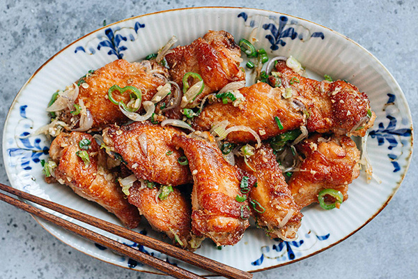 Нарезанные и промытые крылышки помещаются в большую миску. Вливаются светлый соевый соус и рисовое вино, после чего добавляется соль и сахар. Важно хорошо перемешать, чтобы крылья покрылись маринадом, и оставить на 20 минут для пропитывания.