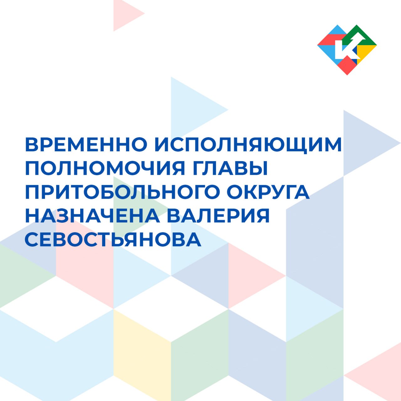 Временно исполняющим полномочия главы Притобольного муниципального округа назначена Валерия Севостьянова – управляющая делами – руководитель аппарата администрации Притобольного муниципального округа.