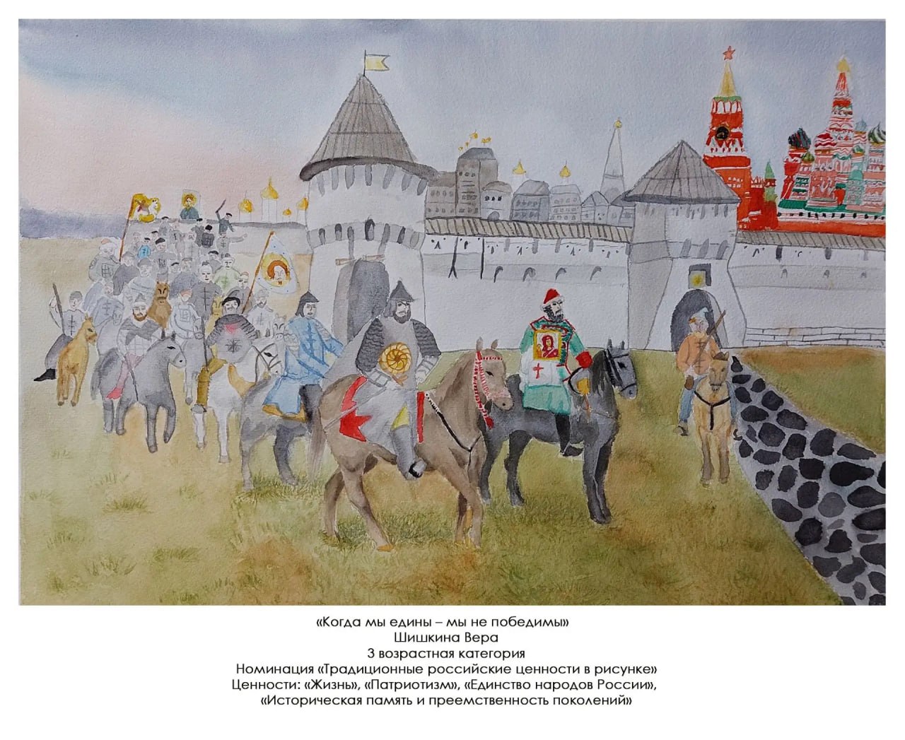 В этом году из Курганской области на конкурс поступило всего 57 работ. Среди конкурсантов рисунок Веры Шишкиной из школы классического реализма. Работа была признана одной из лучших о традиционных российских ценностях.