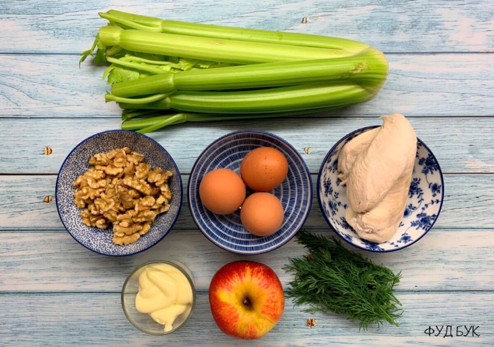 Не стоит забывать и о варианте с сельдереем. Для освежающего салата подойдёт отварная куриная грудка, стебли сельдерея, кислое яблоко и яйца. Слои пропитываются натуральным йогуртом или майонезом, а сверху посыпается тёртым сыром.