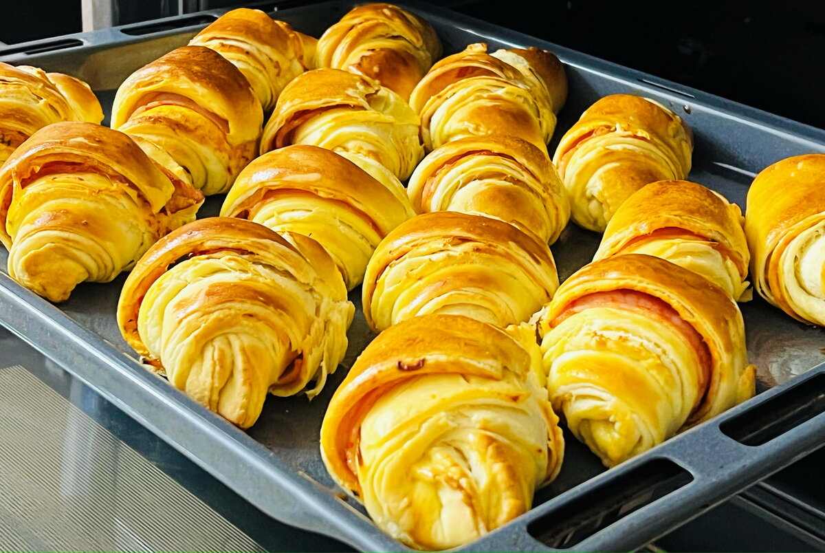 Тонко нанесите на каждую лепёшку размягчённое сливочное масло и сложите их по три в стопку. Заготовки отправьте в морозильник на 15 минут. После этого раскатайте две из них в прямоугольные пласты, смажьте томатным соусом, добавьте начинку и закройте вторым слоем теста. Разделите комбинацию на 8 треугольников и придайте форму круассанов. Выпекайте в разогретой до 180 градусов духовке 25-30 минут. И вот, восхитительная выпечка для всей семьи готова!