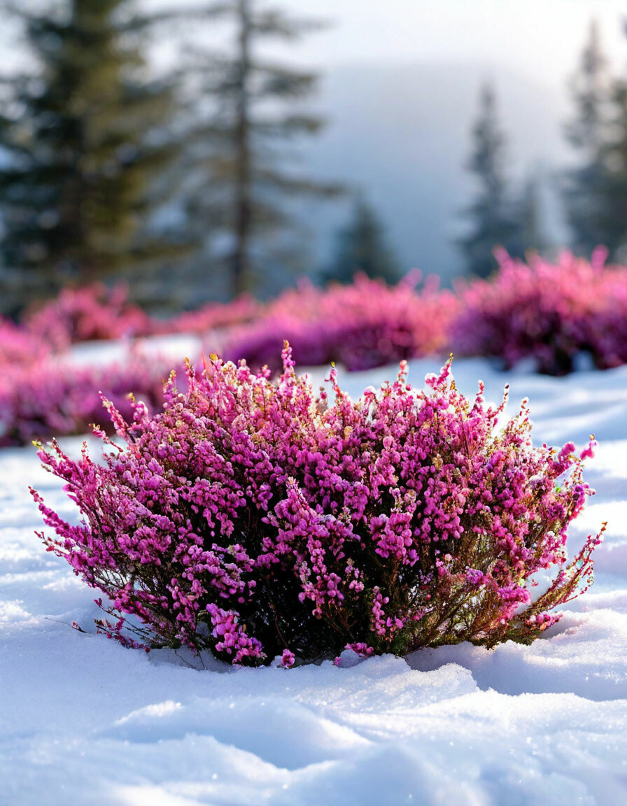 Вереск удивляет своим многообразием. Существует несколько сортов, цветущих в разные периоды: некоторые радуют глаз в июне, другие — в середине лета, а поздние сорта становятся украшением сада в зимний период. Хотя вереск не распускает цветы зимой, его декоративные соцветия сохраняются, создавая иллюзию, что растение продолжает развиваться даже под снегом.