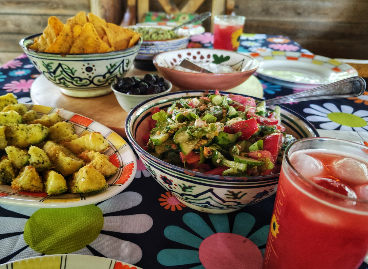 Настроение поддерживалось не только яркими угощениями, но и замечательной атмосферой. Комаров было много, что добавило романтики, а многослойные салаты и десерты великолепно украсили праздничный стол.