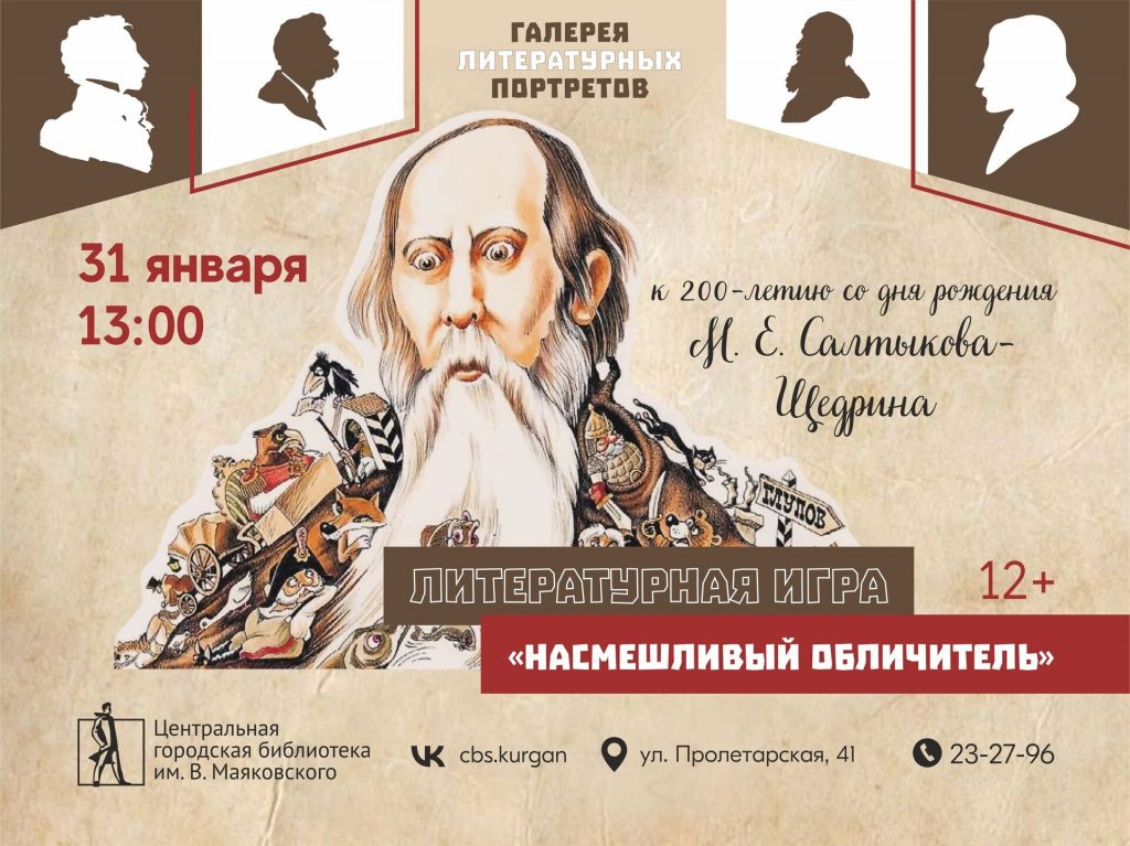 Маяковка приглашает всех любителей литературы 31 января в библиотеку имени В. Маяковского. В этот день состоится литературная игра «Насмешливый обличитель». Участники смогут выбрать одну из категорий, ответить на вопросы, заработать баллы и побороться за победу. Возможно, участники смогут оценить творчество Салтыкова-Щедрина и его вклад в литературу.