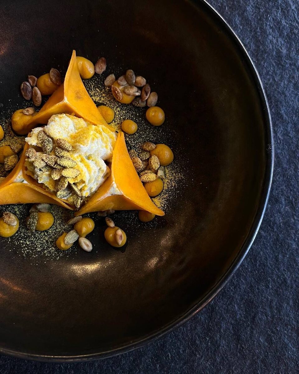 Оставшиеся части тыквы после нарезки сначала просушивают, затем запекают с пряностями и лёгкой сладостью меда. Это даёт глубину и тёплый послевкусие, а мятая тыквенная пудра на тарелке подчеркивает итоговый шарм блюда.