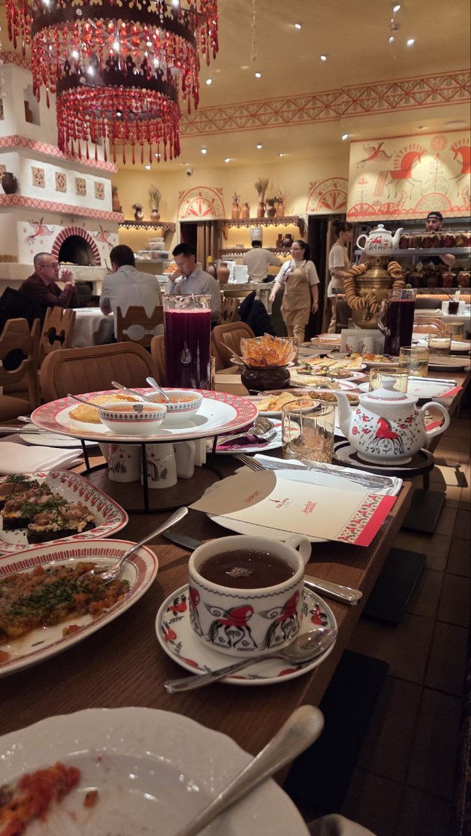 На столах оказались простые, но знакомые блюда: блины с икрой, пирожки с мясом и капустой, а также рожденные из советской памяти новогодние нотки — оливье и сельдь под шубой. В атмосфере камерности и дружеских разговоров время будто замедлялось, предлагая внимание к деталям: декор в дереве, мягкое освещение и легкая музыка, напоминающая о зимних вечерах.