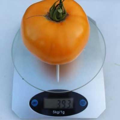 Плоды плоскоокруглой формы с ребристостью у плодоножки обладают плотной кожицей и мясистой, сахаристой мякотью. Вес нередко попадает в диапазон 300–350 г, а первые плоды могут быть крупнее. Цвет во вкусной спелости — насыщенный оранжево-желтый.