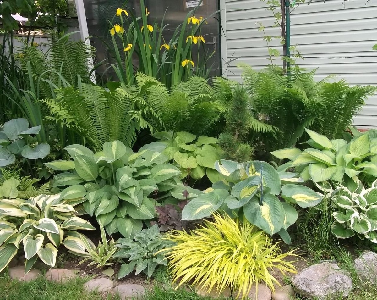 Папоротники предпочитают влажную тень и создают ощущение летнего леса, дополняя тень компаньонами вроде почвопокровных можжевельников и плющей, которые выделяют микрорельеф и аромат.