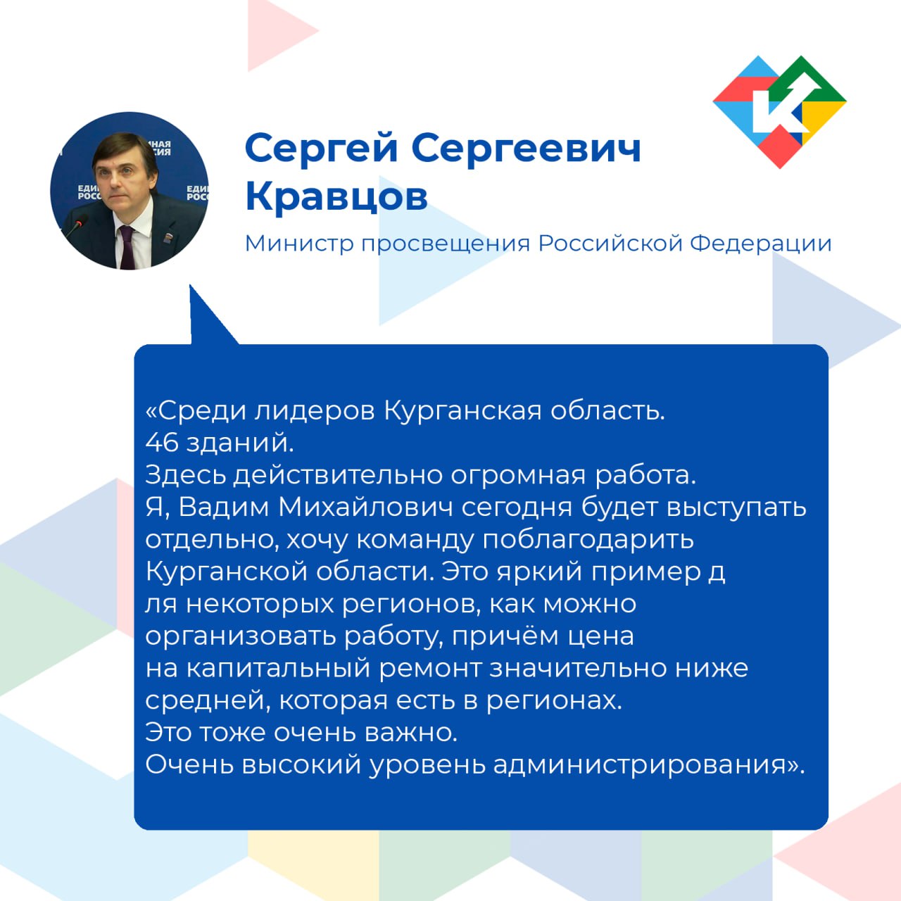 Министр просвещения Российской Федерации Сергей Кравцов назвал Курганскую область примером для регионов России по организации капитального ремонта школ, подчеркнув, что при качестве работ цена ремонтов гораздо ниже средней...