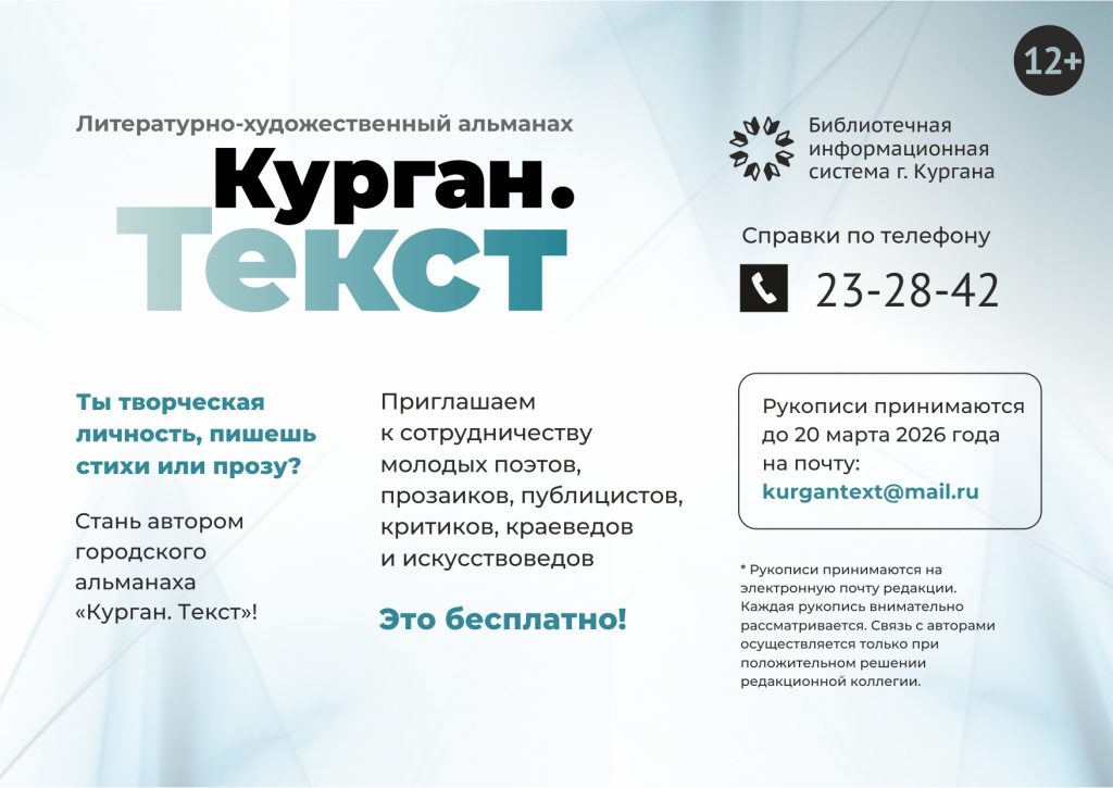 Если вы хотите стать частью этой литературной летописи, отправляйте свои рукописи в электронном формате на адрес: kurgantext@mail.ru. Срок приема работ – до 20 марта 2026 года.