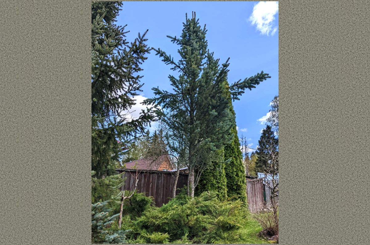 В одном из садов в Зеленограде хозяйка готовится срубить свою ель сорта Picea pungens 'Iseli Fastigiate', так как с каждым годом ее внешний вид становится все более далеким от первоначальной мечты. Первоначально задуманное колонновидное растение постепенно трансформировалось в бесформенное дерево, что вызвало разочарование у садовода.