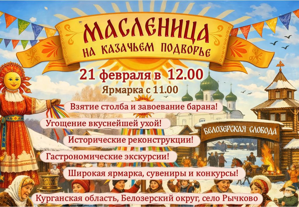 В селе Рычково Белозерского округа на Казачьем подворье 21 февраля состоятся масштабные гуляния в честь Масленицы. Праздник начнется в 11:00 ярмаркой, где можно будет приобрести изделия местных ремесленников, и продолжится в 12:00 большой концертной программой.