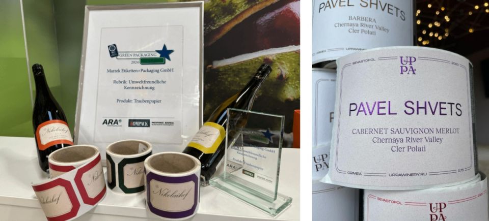 Австрийская компания Marzek Etiketten+Packaging была удостоена награды Green Star за создание такой этикетки, а в России винодельня Павла Швеца UPPA winery также применяет в своих разработках виноградный жмых.