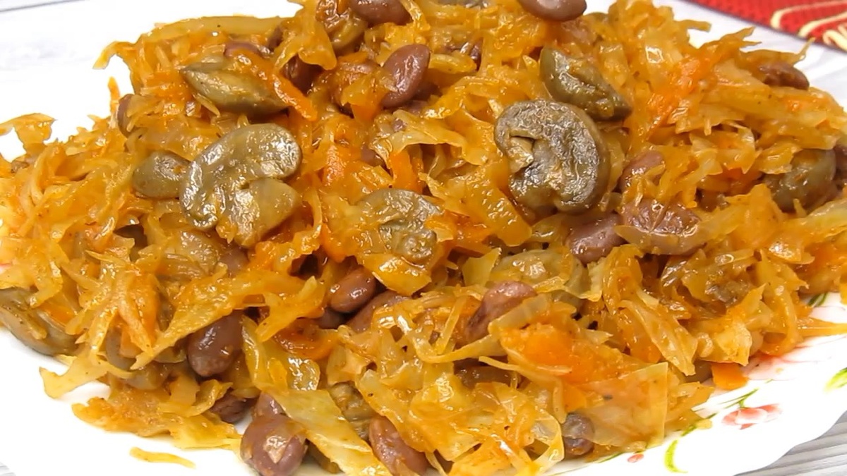 К капусте, нарезанной и предварительно ошпаренной кипятком, добавляются грибы с овощами. Все ингредиенты перемешиваются и тушатся на небольшом огне с добавлением воды, пока капуста не станется мягкой, а лишняя влага не выпарится. Последним шагом стоит добавить консервированную фасоль, это будет прекрасным дополнением к уже готовому блюду.