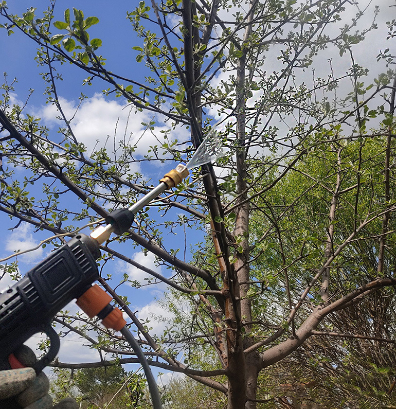 С приобретением нового инструмента, радость от его использования часто переполняет. В этом сезоне был опробован аккумуляторный моечный аппарат, который подходит не только для автомобилей, но и для высокорослых деревьев. Его мощное распыление позволяет с легкостью обрабатывать высокие яблони, не поднимаясь на лестницу.