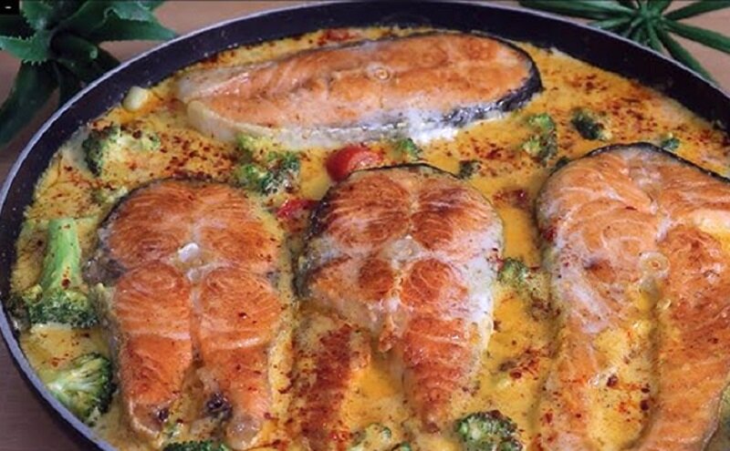 После обжаривания рыбку можно убрать на полотенце, а в сковороду добавить оставшийся чеснок и нарезанный сладкий перец. Обжаривать их следует на протяжении 2-3 минут, после чего вмешать муку, стараясь не допустить образования комков. Как только мука обжарится до золотистого цвета, добавить карри, 400 мл сливок и 200 мл воды. Довести до кипения, добавить брокколи и варить 2-3 минуты. Вернуть стейки в сковороду и аккуратно присыпать молотым красным перцем.