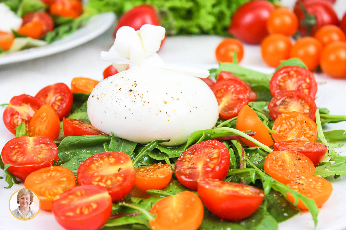 Этот яркий салат состоит из спелых помидоров, свежей зелени и нежного сыра буррата, который сочетает в себе приятную текстуру моцареллы и сливочную мягкость. Он быстро готовится, а его вкус особенно радует в летние дни, хотя подойдёт в любое время года. А для гурманов есть возможность разнообразить блюдо, добавив любимые травы.
