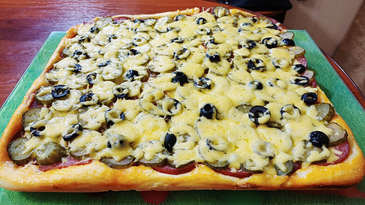 Сформируйте тесто на противне, равномерно распределяя его. Щедро намажьте соусом и выложите все выбранные ингредиенты. В заключение, посыпьте натертым сыром и поместите пиццу в предварительно разогретую духовку до 180°С на 20-30 минут — время зависит от вашей духовки.