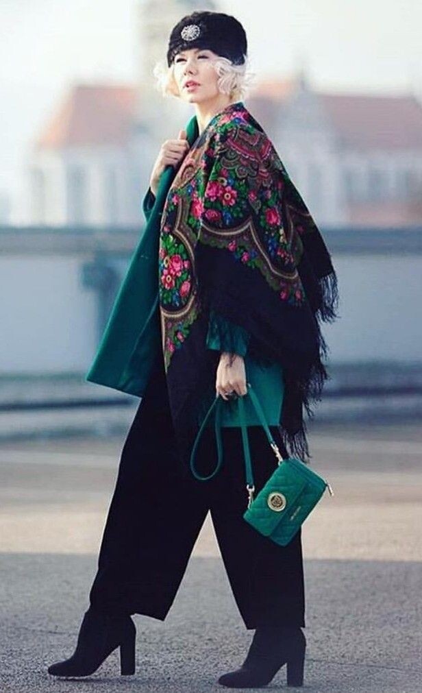 - Платок: Идеальным выбором станет платок с павловопосадскими узорами. Его можно носить как стильный шейный аксессуар к пальто или пиджаку. Но стоит попробовать и более смелые варианты, например, свитшот с этническим элементом — это сочетание современности и традиций.