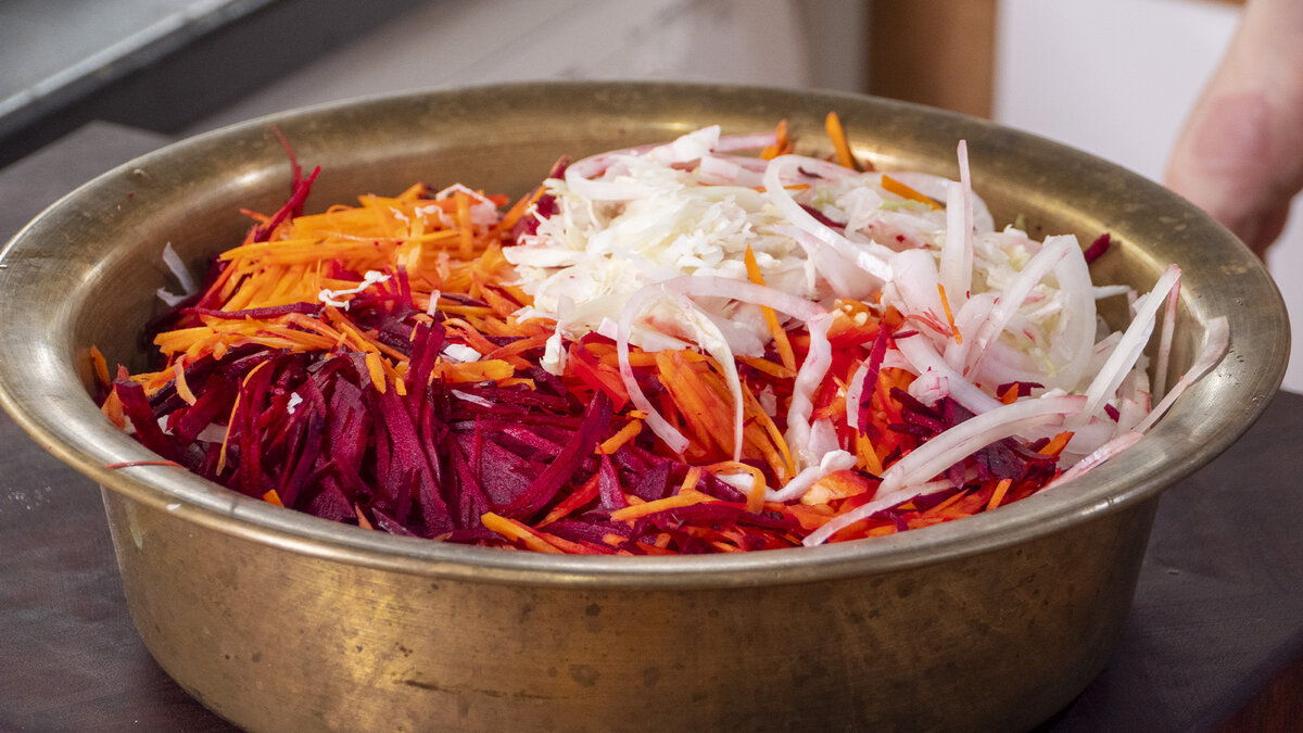 Начать стоит с подготовки овощей. Капусту нарезать тонкими полосками, лук — полукольцами. Свеклу и морковь следует натереть на терке для корейской моркови, добиваясь тонкой соломки. Все подготовленные овощи переместить в большую миску, добавив мелко нарезанный чили для остроты.