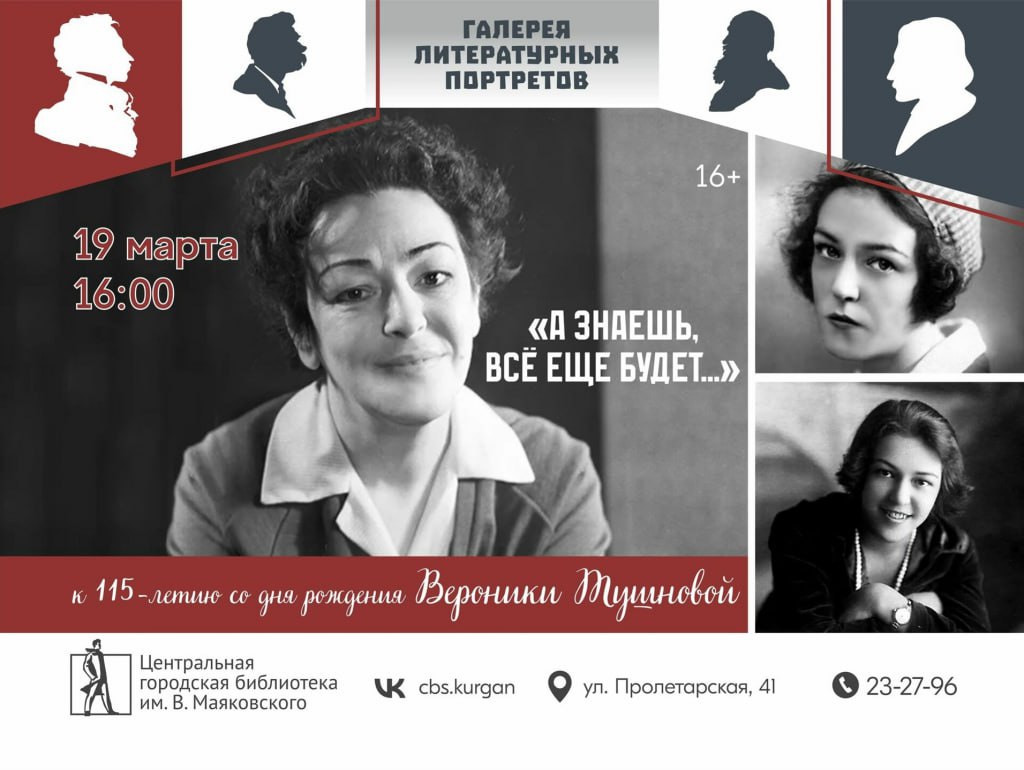 В рамках проекта «Галерея литературных портретов» 19 марта курганцев приглашают присоединиться к литературно-музыкальной гостиной к 115-летию со дня рождения поэтессы Вероники Тушновой, сообщили в БИС города Кургана.