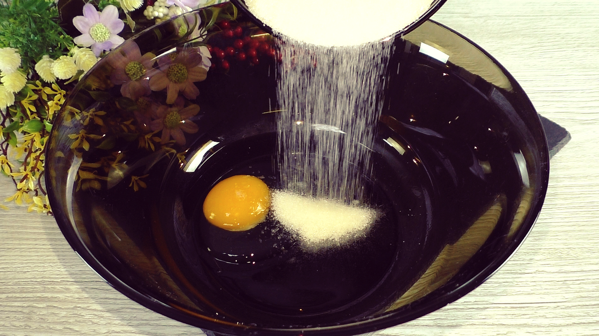 Приготовление начинается с того, что яйцо взбивается с сахаром и щепоткой соли. Использовать миксер удобно, но можно обойтись и венчиком — главное, чтобы масса стала однородной.