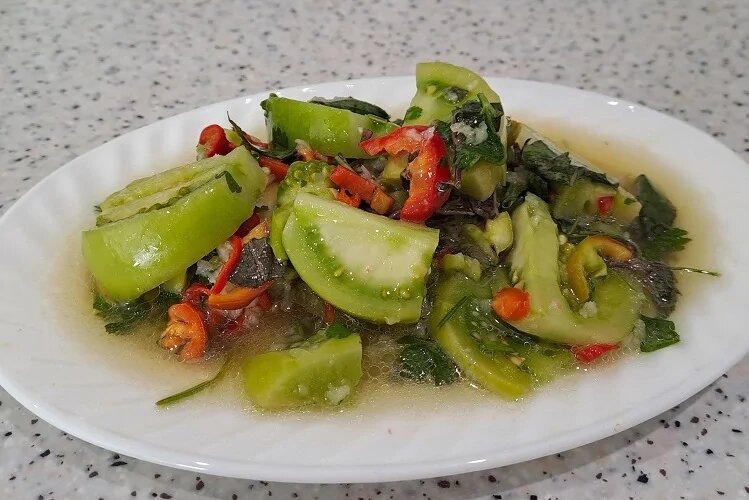 Подготовка ингредиентов: В начале соберите все необходимые продукты и тщательно вымойте их под холодной водой.Обработка помидоров: Нарежьте зеленые помидоры на половинки или четвертинки, убирая плодоножки по желанию.Перец: Очистите красный сладкий перец от семян и плодоножек, нарежьте его кубиками или соломкой, затем поместите в отдельную емкость.Травы: Петрушку и базилик также промойте, мелко нарежьте и выложите в отдельную миску.Чеснок: Очистите и пропустите через пресс, добавьте к травам и перцу.Чили: Обработайте острый перец аналогично, нарезая его мелкими кусочками.Объединение ингредиентов: В великую миску с помидорами добавьте 150 мл уксуса и 100 мл растительного масла.Промытые специи: Всыпьте 2 ст. ложки соли и 4 ст. ложки сахара, затем тщательно перемешайте все ингредиенты.Маринование: Установите груз на смесь помидоров и оставьте на ночь при комнатной температуре для маринования.Хранение: Утром разложите готовые помидоры с рассолом по чистым банкам или герметичным контейнерам и храните в холодильнике.Этот простой и вкусный рецепт позволить сделать уникальную закуску, которая порадует родных и друзей в любое время года. Приятного аппетита!
