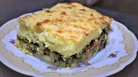 Пришло время собрать запеканку. Смажьте форму для запекания растительным маслом. Выложите половину картофельного пюре, так чтобы оно полностью закрыло дно. На него равномерно распределите начальную начинку, затем накройте оставшимся пюре и посыпьте тертым сыром. Отправьте запеканку в разогретую до 200 градусов духовку на 20-25 минут. И вот, аппетитная запеканка готова!