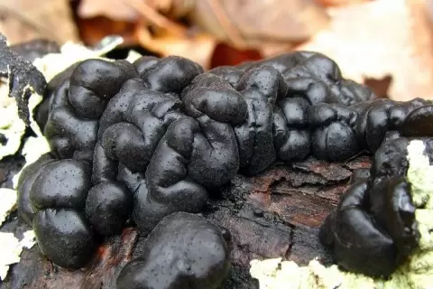 - Масло черной ведьмы (Exidia glandulosa): Этот чёрный гриб, напоминающий желе, встречается в лесах Северного полушария на гниющих ветках лиственных деревьев. Он славится своей необычной способностью к воскрешению: после засухи он сжимается до корочки, но после дождя вновь наполняется жизнью.