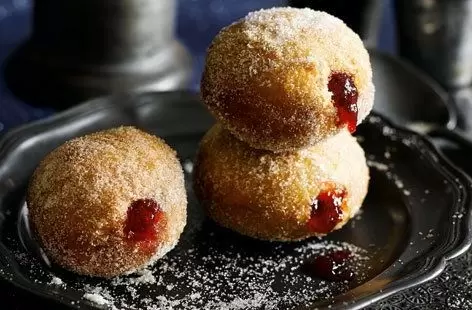Тем временем, в глубокой кастрюле нагреть 1-2 литра подсолнечного масла до 160 °C. Пончики жарить партиями по 2-3 минуты с каждой стороны до золотистого цвета. Готовые пончики вынимать и оставлять остывать на бумажном полотенце. Когда они остынут, с помощью шпажки сделать небольшие отверстия и наполнить их 340 г клубничного джема. Для завершающего акцента обвалять теплые пончики в сахарной пудре. Вариации начинки могут включать свежий ванильный заварной крем или шоколадную пасту на любой вкус!