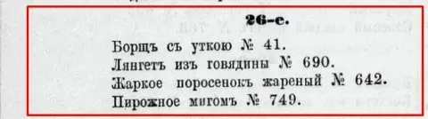 Январь 1875 года оставил яркий след в кулинарной истории, и обед, предложенный в книге "Полная поваренная книга русской опытной хозяйки", яркое тому подтверждение. В обеденном меню значились такие изысканные блюда, как борщ с уткой, лангет из говядины, жаркое из молочного поросёнка и пирожное «мигом».