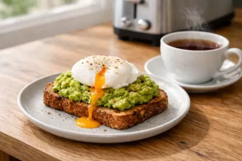 Калорийность и макроэлементы подобраны так, чтобы дать ощущение сытости с утра: хлеб цельнозерновой — 30 г, авокадо — 50 г, яйцо — 1 шт. Быстрое приготовление и мягкая текстура не перегружают утро.