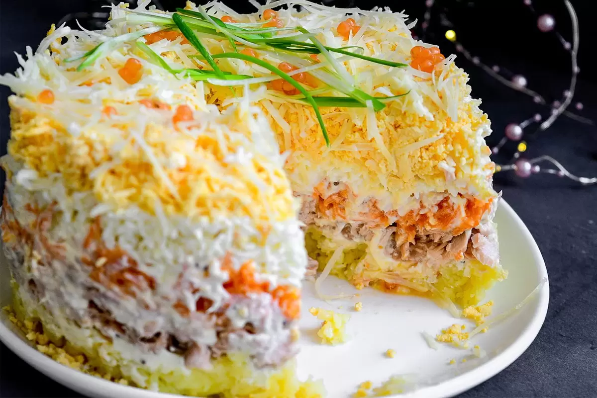 Приготовление: Отварите картофель, морковь и яйца. После охлаждения натрите картофель и морковь на тёрке, яйца разделите на белки и желтки. Сначала выложите слой натёртого картофеля в форму, затем консервированную рыбу, затем морковь. Каждый слой промажьте майонезом. Сверху посыпьте мелко нарезанным луком и украсьте натёртыми белками и желтками для эффекта "мимозы". Салат лучше подавать охлаждённым.