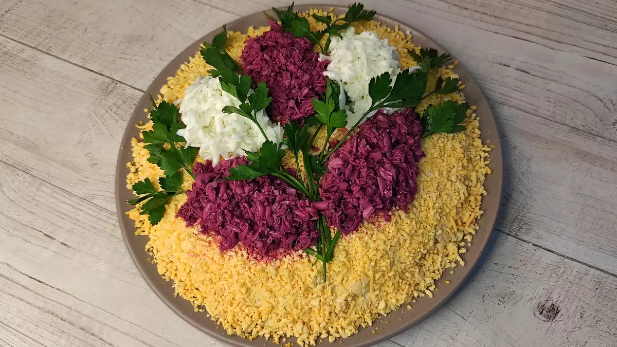 6. Для украшения натирайте белки и разделите их на две части. Одну часть смешайте со свекольным соком, а другую оставьте белой. Выкладывайте их на салат так, чтобы они напоминали цветы сирени.