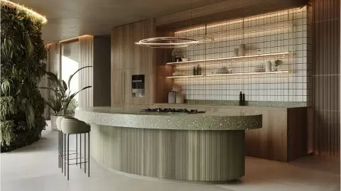 При планировании кухни так же важно учитывать не только материал, но и его форму. Обратите внимание на тренды и решения для интерьеров с нестандартной геометрией.