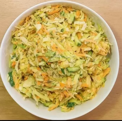 Первым делом капусту следует мелко нашинковать и поместить в салатник. Затем свежие огурцы нарезают соломкой и добавляют к капусте. Морковь натирают на крупной терке и также добавляют в общую массу. Далее, яичные белки, которые уже отварены, натираются и добавляются к овощам.