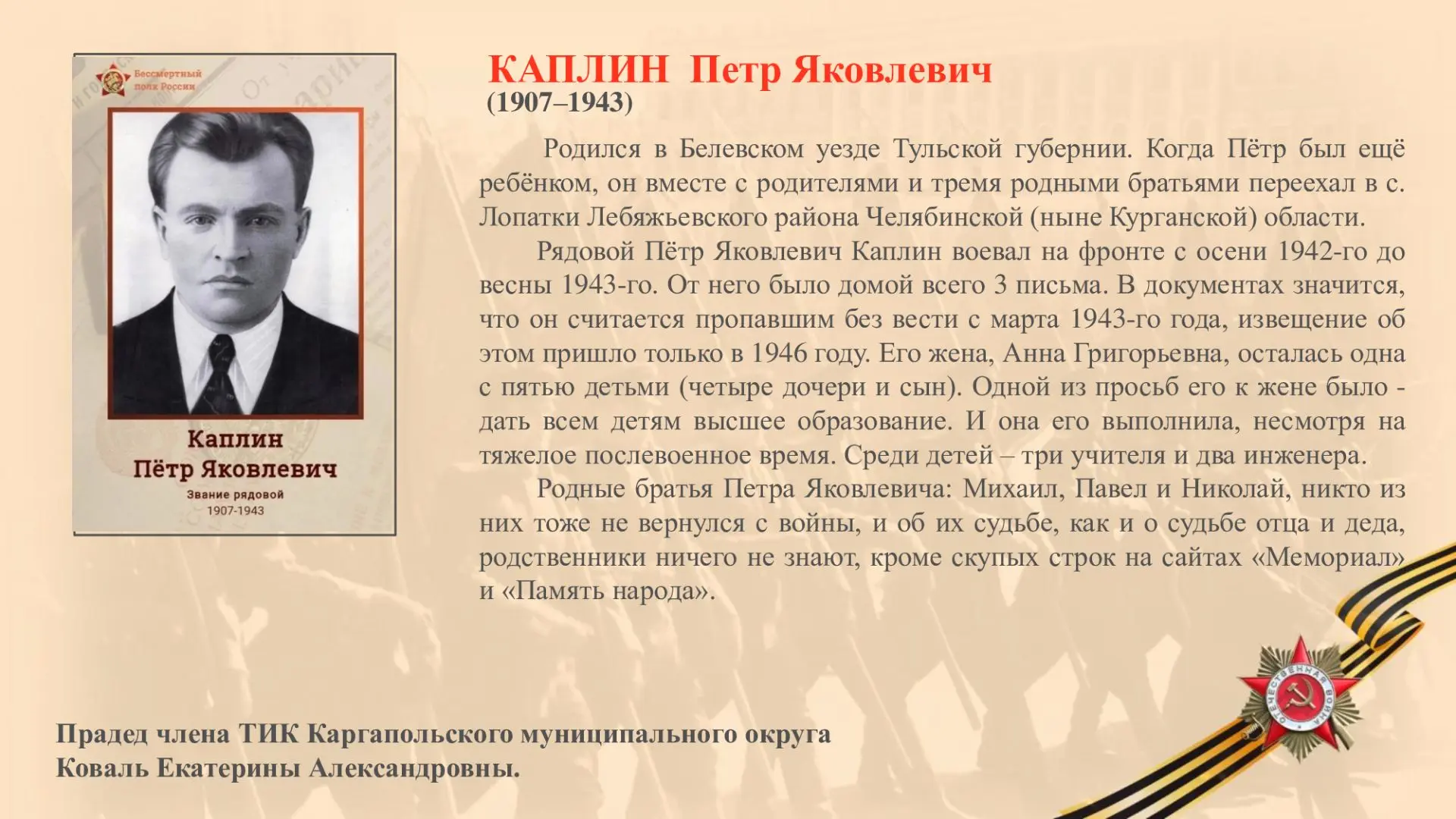 Рядовой Пётр Яковлевич Каплин воевал на фронте с осени 1942-го до весны 1943-го. От него было домой всего три письма. В документах значится, что он считается пропавшим без вести с марта 1943-го года, извещение об этом пришло только в 1946 году. Его жена, Анна Григорьевна, осталась одна с пятью детьми. Одной из просьб его к жене было - дать всем детям высшее образование. И она его выполнила, несмотря на тяжелое послевоенное время. Среди детей – три учителя и два инженера.