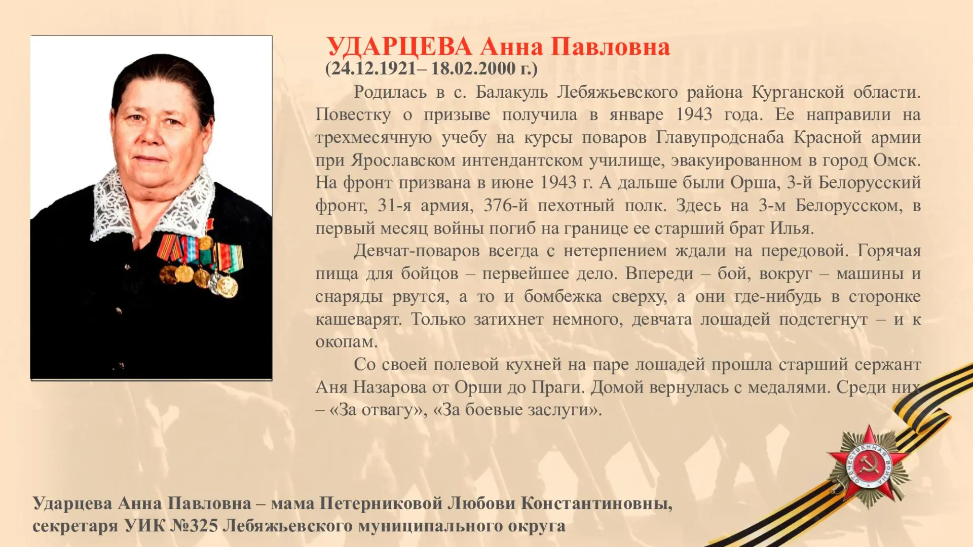 «Я хочу рассказать о своей маме, участнике Великой Отечественной войны Анне Павловне Ударцевой (в девичестве – Назаровой). Родилась 24.12.1921 года в с. Балакуль Лебяжьевского района.