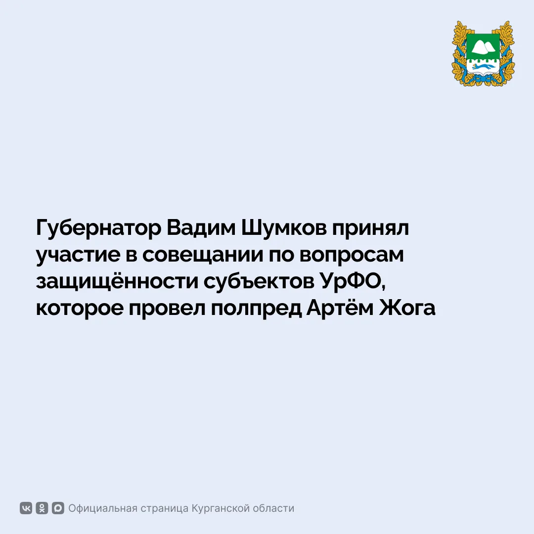 Губернатор Вадим Шумков принял участие в совещании по вопросам защищённости субъектов Уральского федерального округа. Его 27 апреля провёл полномочный представитель Президента России Артём Жога. В совещании участвовали губернаторы регионов округа, представители силовых ведомств, а также главные федеральные инспекторы.