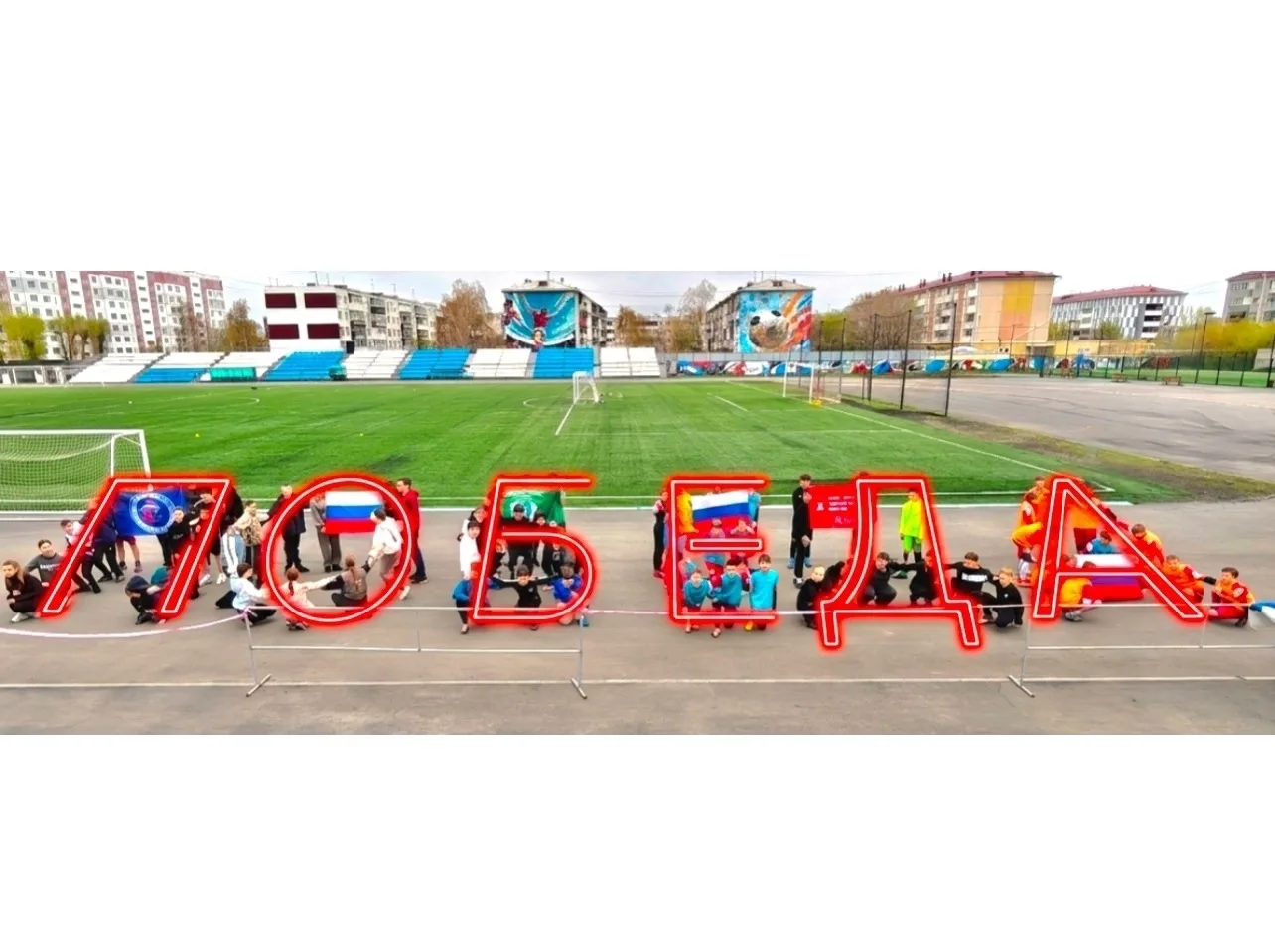 Спортсмены и тренеры-преподаватели ДЮСШ № 3 отделений футбола и фитнес-аэробики, а также воспитанники и тренеры ДЮСШ № 4 отделения бокса, сотрудники городского Центра тестирования ГТО в рамках Всероссийской акции «Наследники Победы», приуроченной к празднованию Дня Победы в Великой Отечественной войне, организовали на стадионе по ул. Т. Невежина, 7 массовый флешмоб.